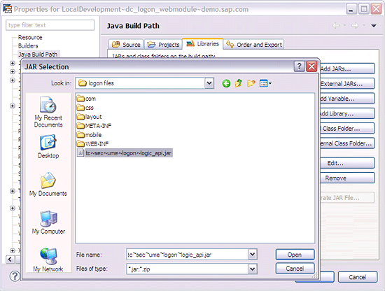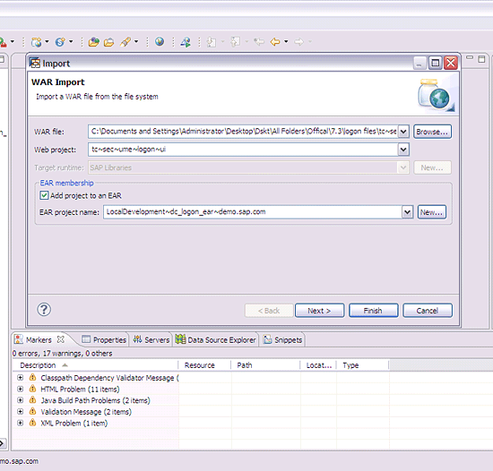 Now you have done the basic groundwork, added references, and added required libraries into your projects. You can now safely move ahead to compare the project structure of the Web Module DC and that of the imported WAR file project. You need to compare them because they need to work perfectly when you want to migrate your old 7.0 logon page DC to the 7.3-based DCs. Because the WAR itself is a Web module deployed as a Web application archive, you can copy and paste all missing resources in the Web Module DC from the WAR project. Remember, logon page logic, JSPs, and web.xml are deployed as a part of the Web Module DC. You do not deploy the WAR project because you need a DC and not a local application deployment.