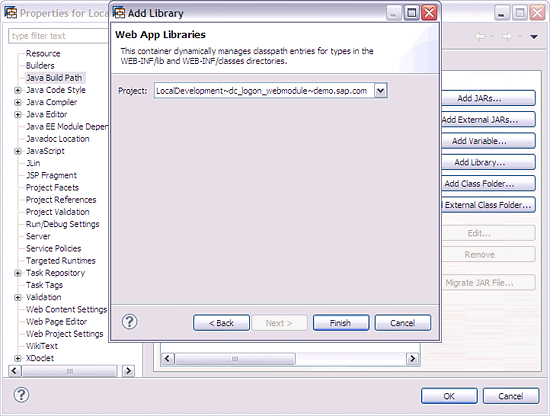 Figure 16, do not select the check box for any Web libraries. If you select any of the Web libraries in this prompt, NWDS creates a separate project for the selected Web library, and you do not need a project to be created for any of the libraries. Instead, you have to add Web libraries in the external Java archive file (JAR) dependency. In the case of NWDI, you have to add new JARs into the library DC and rebuild and deploy it so the 7.3 DC can refer to the required libraries. Adding a local reference is not a recommended way of adding a JAR dependency.