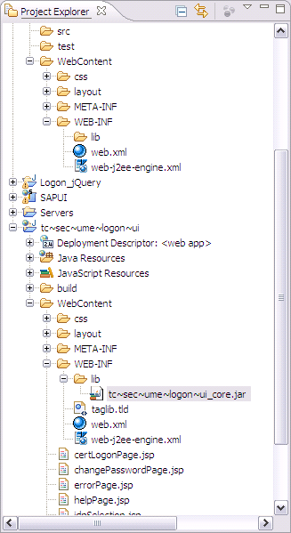 Figure 26. The WAR project contains logon JSP files and other resources. You have to carefully compare the folder structure and add resources from the WAR project into Web Module DC. Begin by copying the CSS and Layout folders from the WAR project into the Web Module DC.