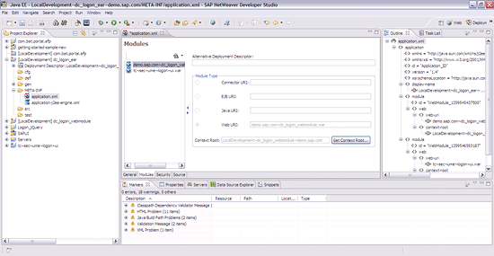 Application.xml and application-j2ee-engine.xml are the two files you find in the Enterprise Application DC. Remember that you changed the Java EE Version of both DCs from 5.0 to 1.4. Let’s assume that by oversight you forgot to do this. You have already created both DCs and now when you expand the Enterprise Application DC to make changes in the application.xml and application-j2ee-engine.xml files, you cannot find these files in the project structure. You can see these files in figures in this article, but when you create these DCs of your own, you cannot find both of the required files.
