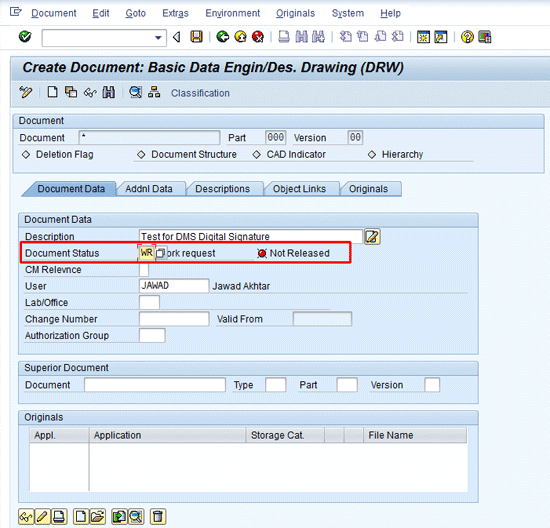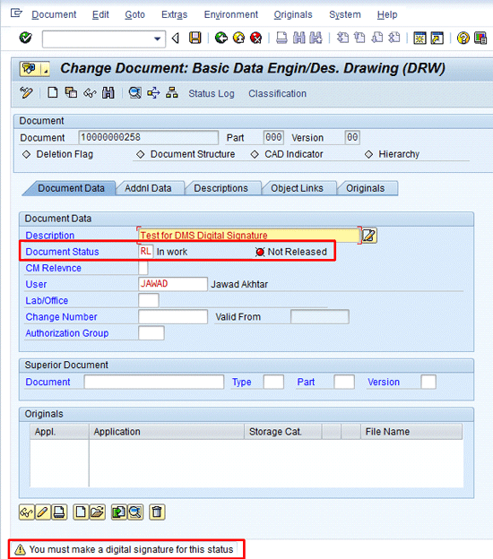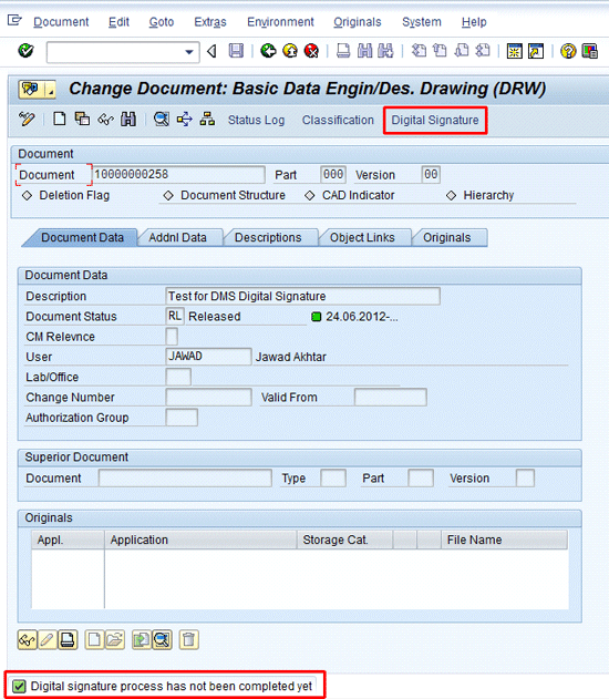 Now log in to the SAP system with a different user name (I used LLong in my example) and use the change document transaction code (CV02N) or refer to Figure 22 and enter the same DMS document number (10000000258), document type (DRW), document part (000), and document version (00). Once you’ve entered this information, press enter, which takes you to the screen in Figure 27. At the bottom of this screen, you get a message that says the digital signature process is not complete. Click the Digital Signature button in Figure 27, which takes you to the screen in Figure 28.