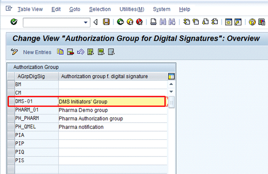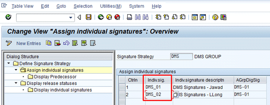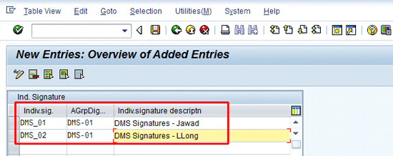 Click the New Entries button, which leads to Figure 4. In Figure 4, two individual signatures are defined, namely, DMS-01 and DMS-02, with descriptions. Both individual signatures are assigned to the same authorization group— DMS-01. Save the entries by pressing Ctrl+S or clicking the save icon.