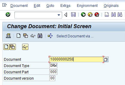 In Figure 20, enter the document number (10000000258, in my example), document type DRW, Document Part 000, and Document version 00. Press Enter, which leads to Figure 21. In Figure 21, change the document status to IW and save by clicking the save icon or pressing Ctrl+S.