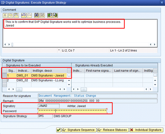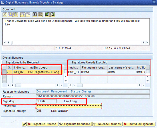Figure 11 is the signature sequence in which individual signature DMS_01 must be signed before individual signature DMS_02. Click the enter icon in Figure 11, which leads to Figure 12.