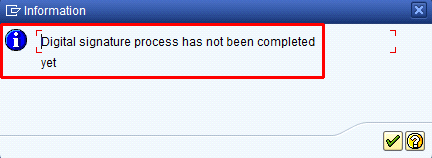 In Figure 25 a comment box is available to add comments. Select individual signature DMS_01, type the SAP password, and press Enter, which results in the screen in Figure 26. Figure 26 is the pop-up information message that tells you that the digital signature process is still incomplete.