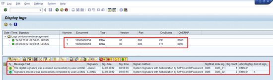 In the Applic. (application) field, select DMS and do not give any other selection criteria. Press F8 or click the execute icon to go to the screen in Figure 31. This screen provides a comprehensive log of digital signatures for DMS document 10000000258. The bottom half of the screen provides details about who executed the digital signatures and when the signatures were executed. It also provides details of the individual signatures (DMS_01 and DMS_02) as well the signature strategy DMS.