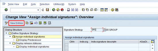 The Displ. comment column enables a user to enter comments to be displayed when the digital signature is executed. In the Display Remark column, users can view a short text before signing. The Displ. Document column is an option to allow or disallow viewing of a DMS document. The Verify column with the check box verifies the sequence of the digital signature, known as the signature strategy, before the system marks the document as complete. To define a new signature strategy, make your selections in the appropriate columns, and then click the New Entries button in Figure 5, which leads to Figure 6.