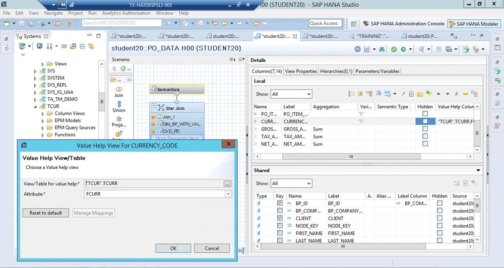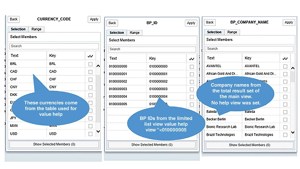 In Figure 7, the currencies listed on the left are from the table that is used for help values. The business partner IDs (the middle column) are from the limited list view value help. The company names (the last column on the right) are pulled from the result set of the main view because no help view is set.