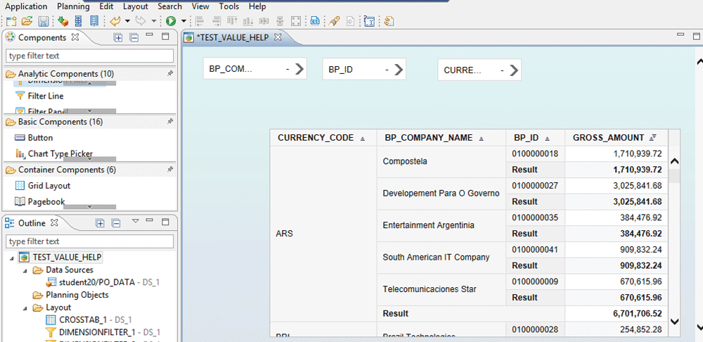 In my example in Figure 6, I used an SAP BusinessObjects Design Studio application and inserted three drop-down filter options on the dashboard: BP_COM (business partner company name), BP_ID (business partner ID), and CURRE… (currency).