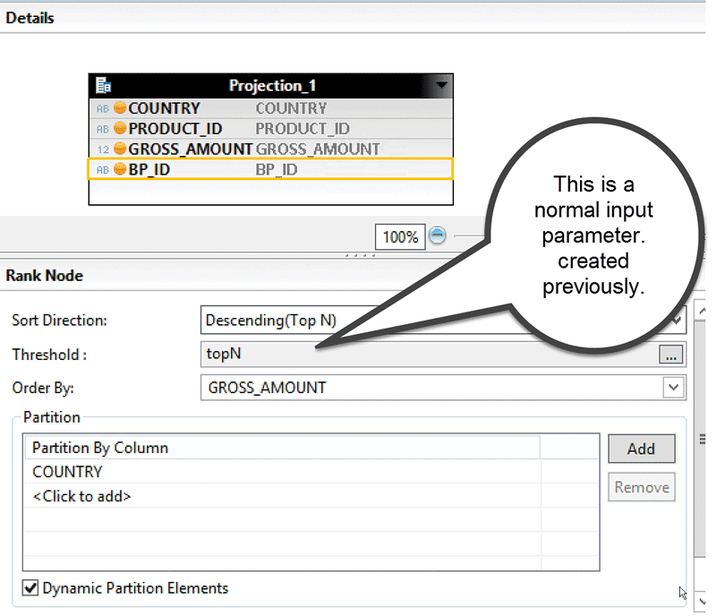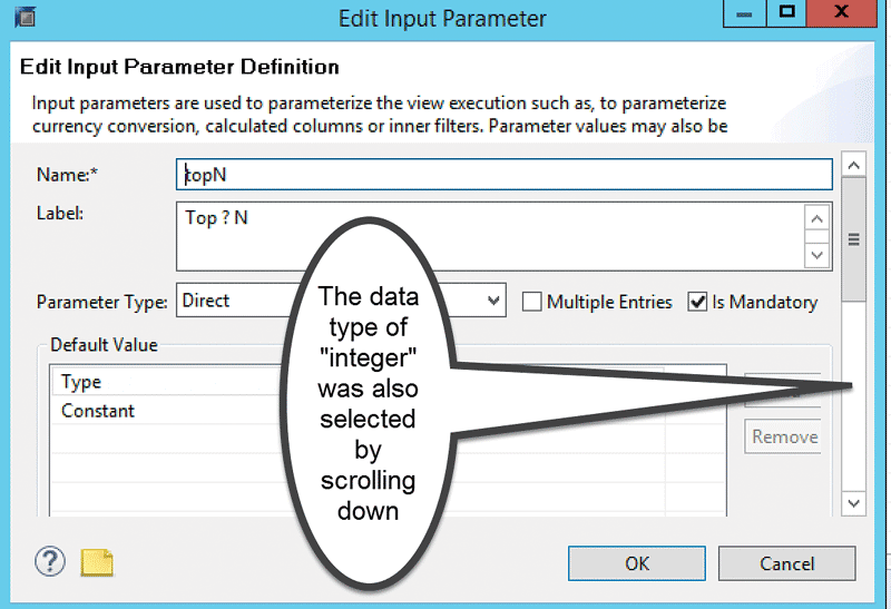The example I show in this article uses a basic concept of a rank node that gets the rank from an input parameter. Figure 8 shows the configuration of the top N input parameter. It is very straightforward. The sister view (not shown) for the bottom N has nearly the same configuration, but the input parameter is asking for the bottom N, not the top N.