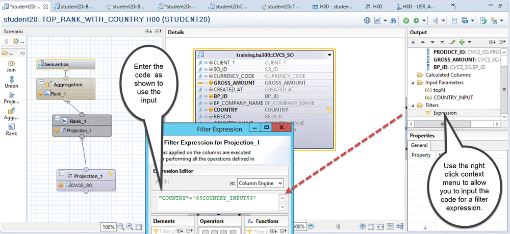 My goal is to filter the data on a country value entered by the user from the choices available in the Country list table. Using variables to prompt for country is one option. I would get a list of choices automatically, but I want to map the selection from one view to the next and this is a feature I want to demonstrated using input parameters. Input parameters, however, are different than variables. Basically, input parameters don’t do anything unless you put them in code (or use them in the rank node as shown previously). If I stop here with this country example the user will be asked to select a country, but the system does not actually filter the data. To finish the task—to have the system filter the data—you need to add a where clause as I show below.