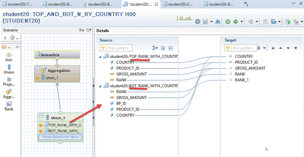 To accomplish this, I need calculation views with rank nodes (one for the bottom and one for the top). I also want the option to reuse these separately, because often just the best or the worst rankings are needed. Therefore, I need a third calculation view to union the results together. However, I do not want to make the user enter more than two inputs—one for country and one for the value of N. I can do this via input-parameter mapping.