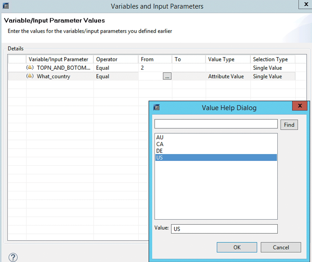 As shown in Figure 13, these input parameters have slightly different names but were created exactly like the ones on the lower-level top and bottom rank views. Note that the What_country input parameter is coming from the higher-level view and it was set up with the value help table just as I showed above on the top N view.