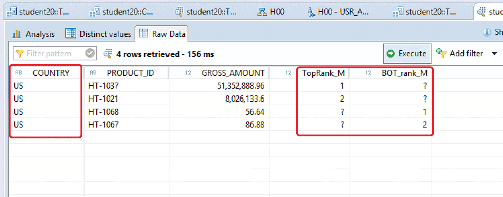 In this scenario, I am using a rank node, which returns either the top N value or bottom N value when the N value is input via a user-supplied parameter. However, the rank node does not return both top N and bottom N values at the same time, which is a requirement of my scenario. In addition, I want the resulting top and bottom N values to be country specific.